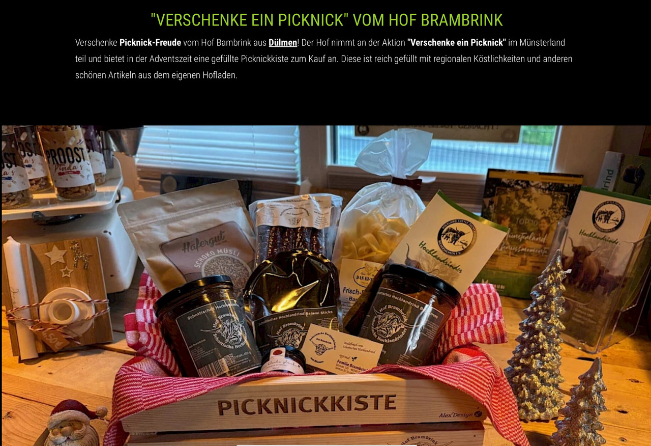 Packen Sie ihren Picknickkorb direkt bei uns, genießen Sie regionale Leckereien und machen sie es sich auf unseren Picknickflächen gemütlich, mit Blick ins Grüne, unseren Hochlandrinder und viel Platz zum Durchatmen.